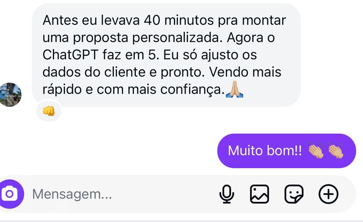 Você vai aprender os fundamentos práticos que eu uso todos os dias com IA. Vai saber personalizar o ChatGPT pro seu jeito de falar, criar prompts que funcionam de verdade, produzir conteúdos, montar propostas, organizar decisões, analisar concorrência e muito mais. É um passo a passo direto, que te dá domínio pra aplicar o ChatGPT em qualquer situação do seu dia a dia.